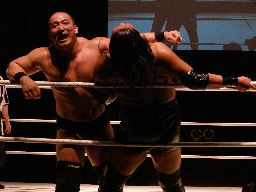 コーナーでブレーンクロー、さらにロープにノドを押し付けて体重を掛ける(右写真)。HARASHIMAにタッチ。