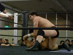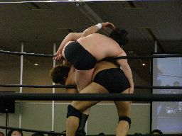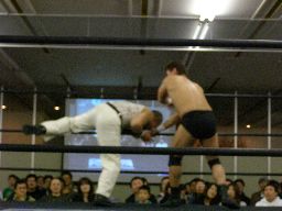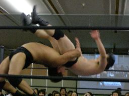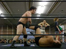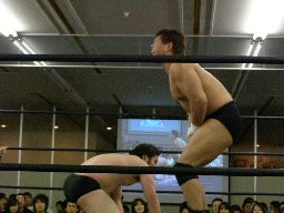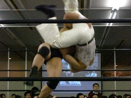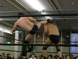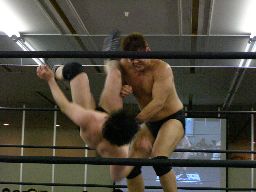 ベルナルドと柿本が戻る。ベルナルドロープに振る、柿本切り返してパワースラム(右写真)。2人また場外に。アントンと諸橋がリングに。
