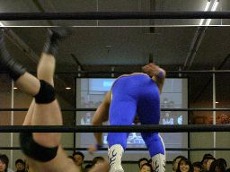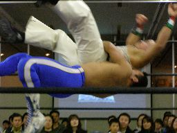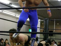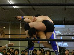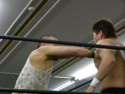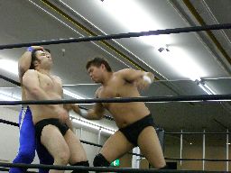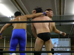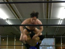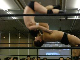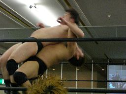 アントンロープに飛ぶ、諸橋すくい投げ、アントンはベルナルドにタッチ。ベルナルドキック入れて(右写真)イーブンフローDDT、カウント2。