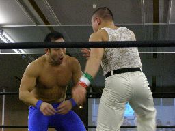 ベルナルドパンチ、柿本かわしてT-boneスープレックスの体勢、ベルナルドブロック。柿本ロープに飛ぶ、ベルナルドラリアット、柿本かわしてフライングショルダーブロック(左写真)、諸橋にタッチ。ベルナルドもアントンにタッチ。