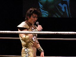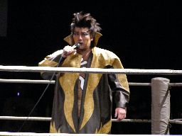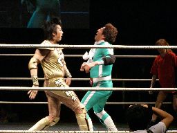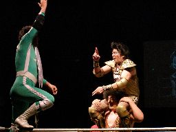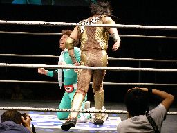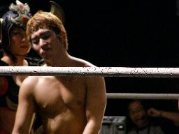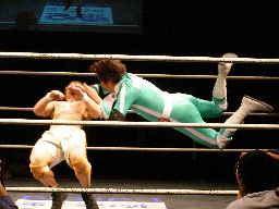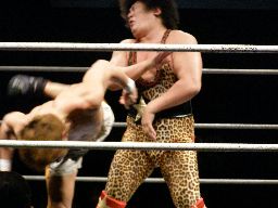 高マムシにブレーンバスター狙うが高マムシは空中で切り返して着地、ロープに飛ぶ、マッスルはキャッチしてベリートゥベリー(左写真)。