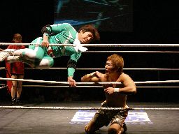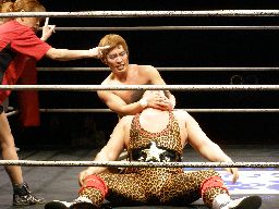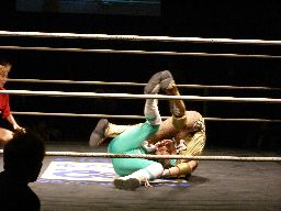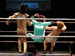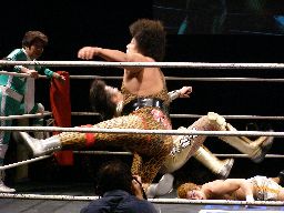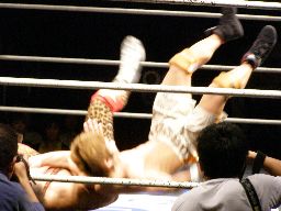 ゴージャスは雪崩式リングイン、ヒザで歩いてエプロンに出ようとしてたマッスルのアキレス腱の辺りに着地。これは痛い!ゴージャス構わず高マムシにドロップキック(右写真)、クロスアタック、