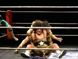 ポイズンロープに振ってエルボー、倒れたところにニースタンプ2発、エルボードロップ、カバー、カウント2。キャトルミューティレーション狙う(右写真)がこれはゴージャスが未然に阻止。5分経過。