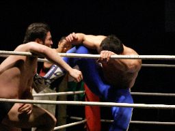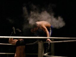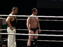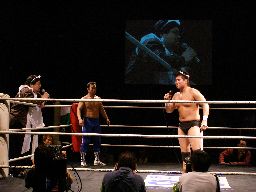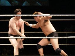 しかし痛い所を突かれたアントンは「らちが明かねえ!」と先制攻撃、乱闘で試合スタート(左写真)。諸橋とアントンが腕の取り合い、首の取り合い。アントンオーソドックスな動きにちゃんと着いて行く。諸橋は柿本にタッチ。
