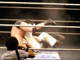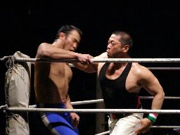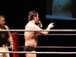 諸橋キック、逆水平連打。アントン「NO,NO」と後ずさりする(左写真)ふりしてサミング。トーゴーにタッチ。