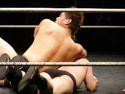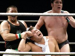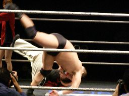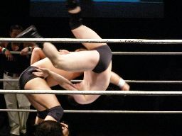 柿本ターンバックルにぶつけパンチ。ロープに振る、アントンかわしてネックブリーカードロップ(右写真)、トーゴーにタッチ。