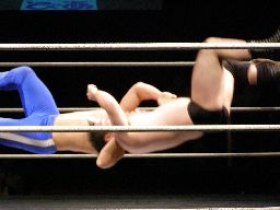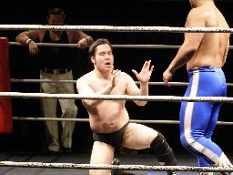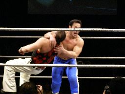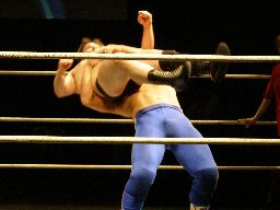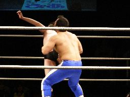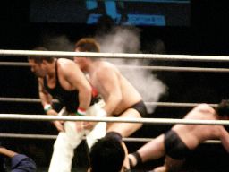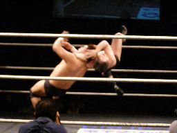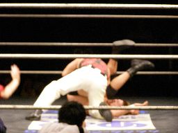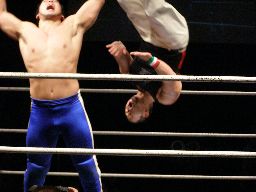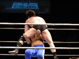 諸橋首投げからスリーパー、トーゴーブレークしてアントンにタッチ。アントンと諸橋エルボーの打ち合い。アントンパンチ連打、ブレーンバスター狙うが諸橋ブロックして逆に投げる(右写真)。柿本にタッチ。