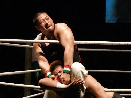 柿本ロープに振ってエルボー、倒れたところにストンピング。柿本逆水平、アントンもチョップ打ち返す。柿本チョップ連打(左写真)、アントンフレアー式前受身。5分経過。