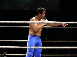 トーゴーナックル、ロープに振ってスリーパーホールド。ロープを使っての攻撃。首投げで座らせて顔面にトラースキック。そしてその場飛びムーンサルトプレス、諸橋がカット。柿本バック取る、トーゴー急所蹴り。トーゴーはロープ越しのチンロック(左写真)、アントンにタッチ。