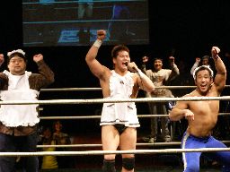 柿本が「こんな変なカッコさせやがって!」とボヤくとキングまたエプロンに上がり「お前もか?」