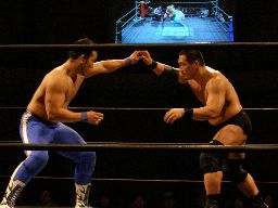 先発は高木と諸橋(右写真)。この対戦は珍しいかも。ロックアップから腕の取り合い、諸橋カニばさみで倒してヘッドロック。高木切り返してフライングメイヤー、諸橋はヘッドシザーズ。