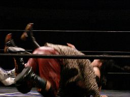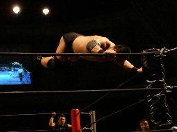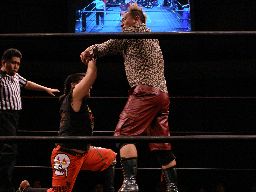 高木肩車に、諸橋がドロップキックで阻止(右写真)。しかしその勢いで猪熊はノドからトップロープに。ハイアングルのスタンガン状態。
