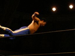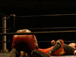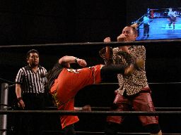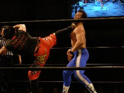 猪熊ロープに飛ぶ、キッドカウンターのトラースキック(左写真)、猪熊倒れながらキッドの股間を蹴り上げる。ダブルノックダウン。両者四つんばいで互いのパートナーにタッチ。