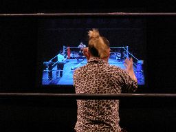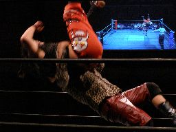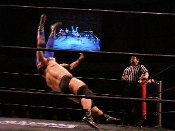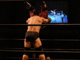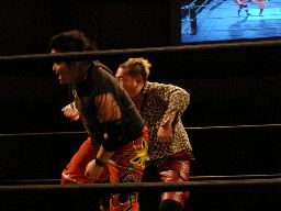 キッドロープに振る、諸橋切り返してクォーラルボンバー(左写真)、猪熊にタッチ。