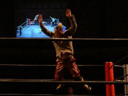 再度ロックアップ、高木バック取ってグラウンドに、首を取る、諸橋切り返す、高木立ち上がってコーナーに押し込む(左写真)、キッドにタッチ。