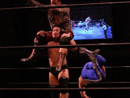 珍しいダブルアームスープレックス(右写真)、カウント2。さらにブレーンバスター、これも2。キッドにタッチ。