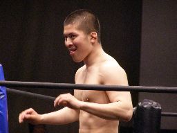猪俣張り手連打、高木一発で返す。猪俣ロープに飛ぶ、高木サンシローズライン(右写真)。