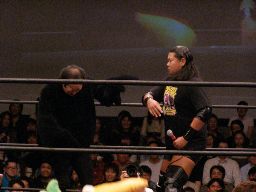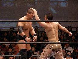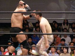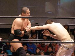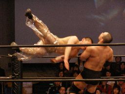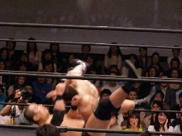 ロックアップ、高木が腕を取る、猪俣切り返す、高木さらに切り返す(右写真)。猪俣エルボー入れて腕取り返すが高木はすぐに切り返してフライングメイヤー、猪俣ヘッドシザーズで返す。高木再度フライングメイヤー、猪俣またヘッドシザーズ。