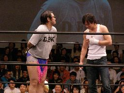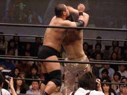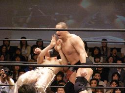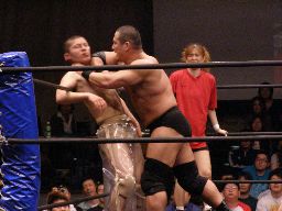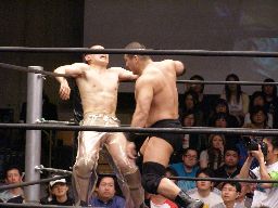 猪俣ボディスラム狙う、しかし上がらない。猪俣ヘッドバット入れて(左写真)再度トライ。これも上がらず。高木が腰にパンチ。