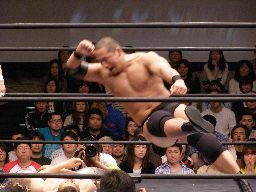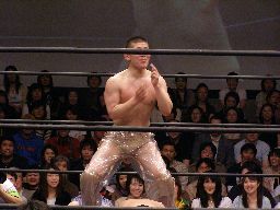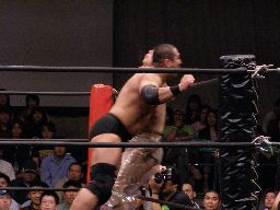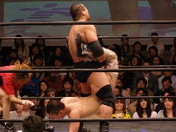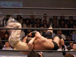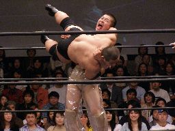 猪俣コーナーに上ってダイビングヘッドバット(左写真)、カウント2。