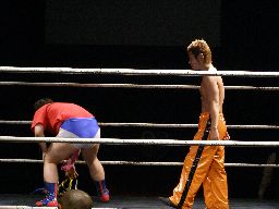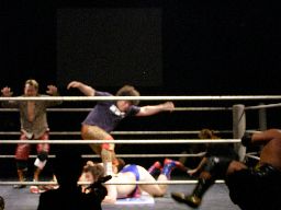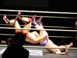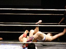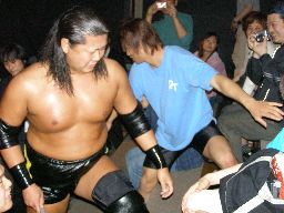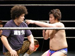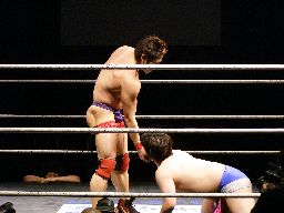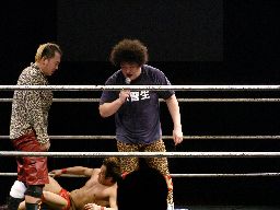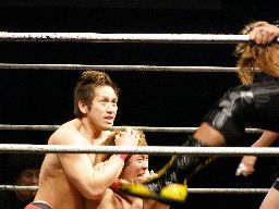 マイケルヘッドロックに、高梨ロープに振るがマイケルはショルダーブロック、大鷲にタッチ。大鷲ボディスラム、「試合中に不謹慎なんだよ、この口が!」と顔面を中心に踏みつける(左写真)。高梨ノーマイクで「コンドー・・・痛い・・・」とつぶやく。大鷲はマイケルにタッチ。