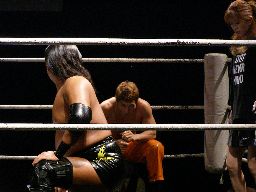高梨が「マイケル、目を覚ませ!」とミサイルキック(右写真)。