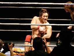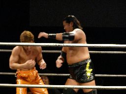 チョークスラムに行くがこれは高梨がウラカン・ラナに切り返す(左写真)。ディーノにタッチ。
