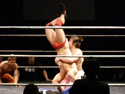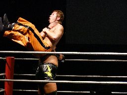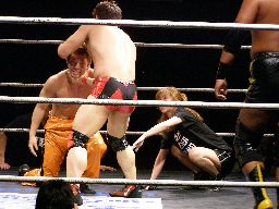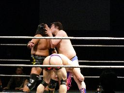 ロックアップ、マイケルがハンマーロックに、ディーノ足をすくって固めるとレッグブリーカー(右写真)。ニースタンプ入れてトーホールド、高梨にタッチ。マイケルも大鷲にタッチ。