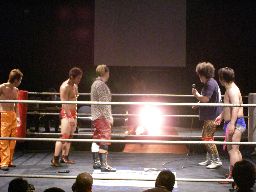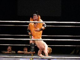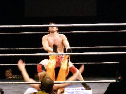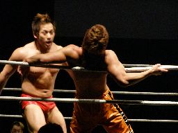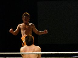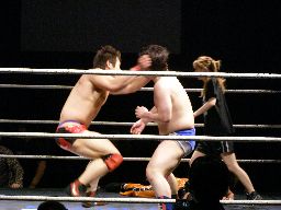 マイケルが腕を取る、ディーノ切り返す(左写真)。しかしいつものように相手の腕を股間に持って行ったりはしない。マイケルヘッドロックからフライングメイヤー、ディーノヘッドシザーズ。マイケル頭を抜いてヘッドロック、ディーノ再度ヘッドシザーズ、マイケルロープ。