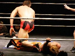 マイケルが入りスパインバスターからジャックナイフ、カウント2。タイツを下ろすと「お前ゲイなんだろ?掘りてえんだろ?」と危険な挑発(右写真)。そして急所にレッグドロップ「。