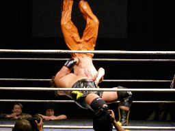 大鷲「さっさと終わらすぞ」と宣言するとブレーンバスター(右写真)からギロチンドロップ、カウント2。