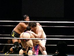大鷲入り高梨にランニングチョークスラム(左写真)。大鷲コーナーに上る。