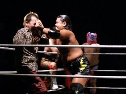 悪人顔の松井レフェリーの「中で悪いことしろ!」という声に従いゲイレーラと高梨がリングに戻ってルチャムーヴ展開(左写真)。
