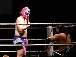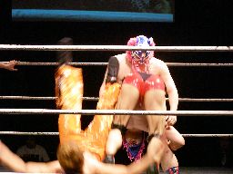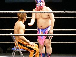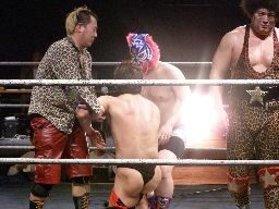 5人一斉に大鷲を攻撃(右写真)。大鷲場外エスケープ。5人もそれぞれ場外に。観客相手にワルを繰り広げる。観客の飲み物を奪い取ったりプルタブを缶の中に落としたり。
