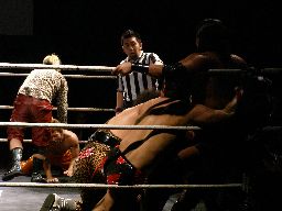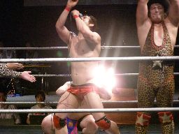 大鷲が3人を振り切って阻止(右写真)。大鷲は猪熊にコーナースプラッシュ、そしてチョークスラム。坂井がカット。