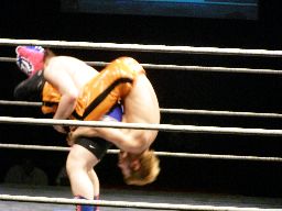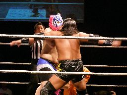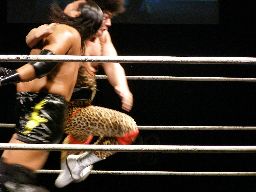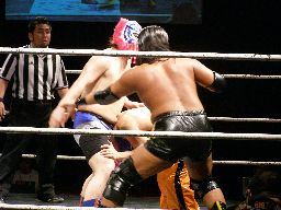 高梨ロープエスケープするが(左写真)放さない。悪いなあ。ゲイレーラは猪熊にタッチ。