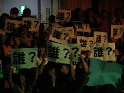 この試合は両チームの希望によりノーDQマッチになった、と新藤リングアナから説明。最初に高木、続いてポイズン。はぐれ新日軍は後藤のテーマで3人一緒に入場。会場からは「誰?」コールと「誰?」ボードの波が(左写真)。