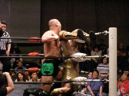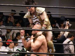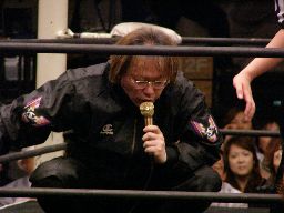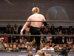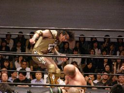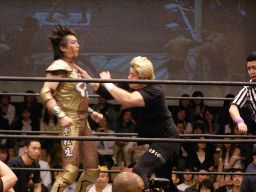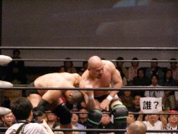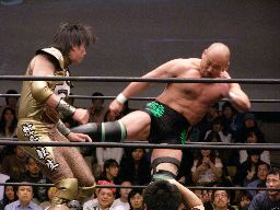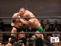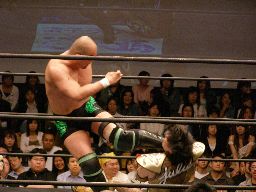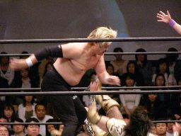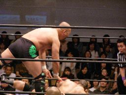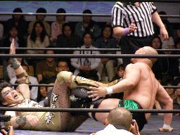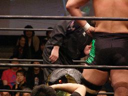 一旦立たせてドラゴンスクリューから足4の字固め(左写真)、後藤がカット。高木が後藤を場外に落とす。
