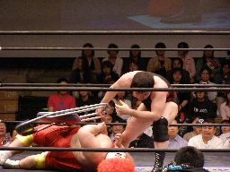 弟ボディスラムからカバー、カウント2。そして逆エビ固め(右写真)、兄は脚力でハネ返す。5分経過。