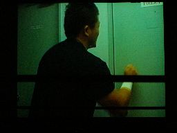 試合前映像。トイレに駆け込むジェット、しかし使用中(右写真)。中からHARASHIMAが出てくる。