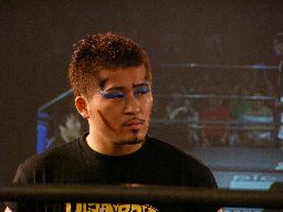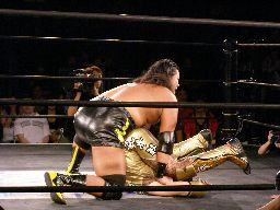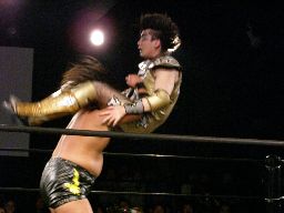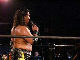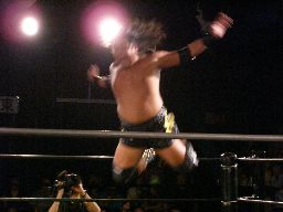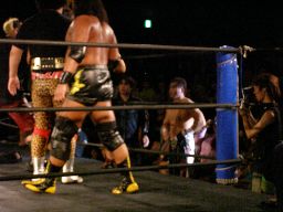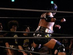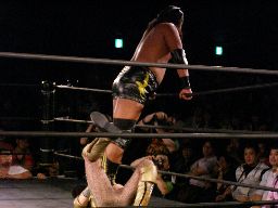 コーナーに上ってダイビングボディプレス(左写真)。大鷲カバーに入る、ポイズンは下から毒霧。かすかにメロンの香り。現地調達?