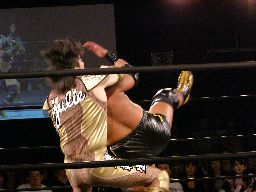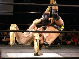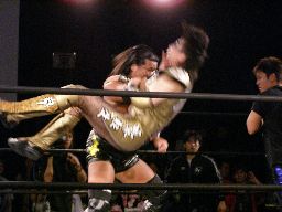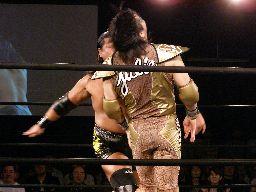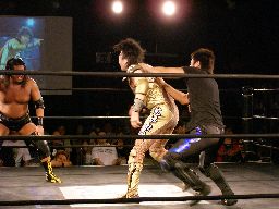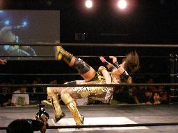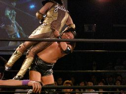 大鷲はブレーンバスターにスイッチ、ポイズンは背後に着地してバックドロップ(右写真)。大鷲場外エスケープ。