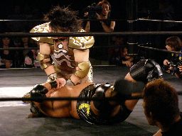 HARASHIMAがハイキック、大鷲チョークスラム(左写真)、カウント2。