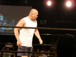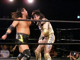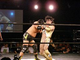 チョップの打ち合い(左写真)。大鷲キック、ヘッドロック、ポイズンロープに振る、大鷲ショルダーブロック。ポイズンショルダーブロック返す。大鷲を倒す。