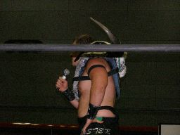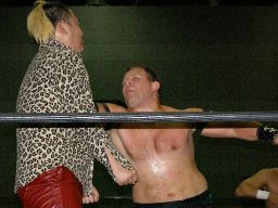 逆水平、ストンピング、スナップスープレックスからニースタンプ、カウント2。そしてナイトメア(右写真)。蛇ットがパンチでカット。ディーノはサウザーの顔面に座り込む。蛇ットがカット。サウザーはグレースのシャツで顔を拭く。タッチしようとするとまた「人質がどうなってもいいのか!」