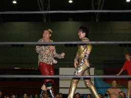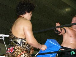 首投げから「死ね〜♥」(左写真)。ディーノは蛇ットを寝せるとロープに飛んで男色クロー。さらにスピニング男色クロー。蛇ットはロープに。ディーノはロープに振ると唇を突き出して待つ、蛇ットかわしてコーナーに逃げる。サウザーにタッチ。ディーノはサウザーが好みでないのかシュンとして坂井にタッチ。