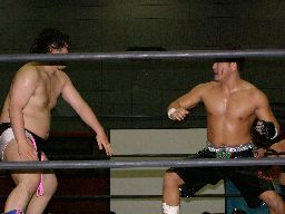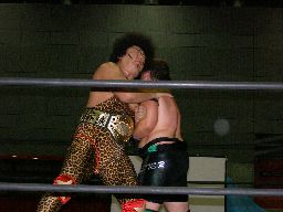 ロックアップ、ロープワークからショルダーブロック合戦、これは互角(右写真)。