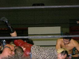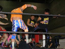 ポイズンがディーノにチョークスラム、猪苦魔サウザーにK7-308、カウントは2。猪苦魔がサウザーを羽交い絞めにして坂井が「アックスボンバー」、サウザーかわして猪苦魔に誤爆(左写真)。