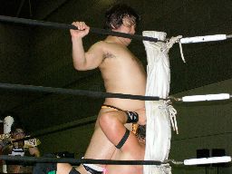 猪苦魔エルボー連打。坂井がまたターンバックルを着脱自由に(左写真)。
