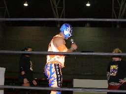 坂井はヘルメットを前後逆にして見えないようにして反撃(右写真)。脱がせてからドロップキック。5分経過。